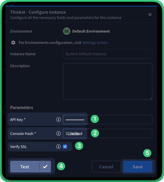Firstly, add your API key ( 1 ) and Console Hash (2) . They are the same hash and key you used in the Configuring the Integration step. Verify SSL should be left checked (3).
