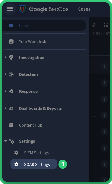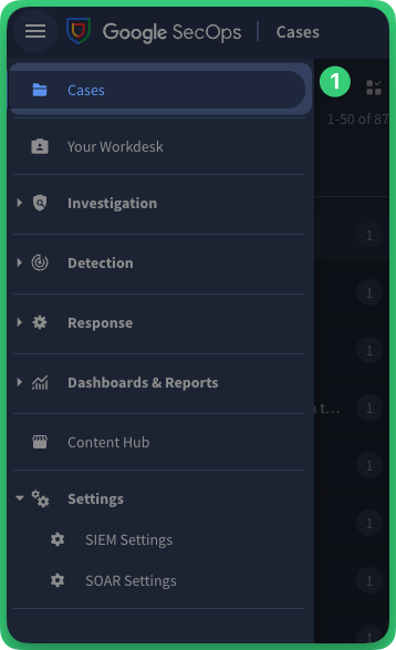 This is not a complete guide on the Google SecOps interface, but just a quick look at what you can expect an alert to look like. Go to the Hamburger menu -> Cases (1).