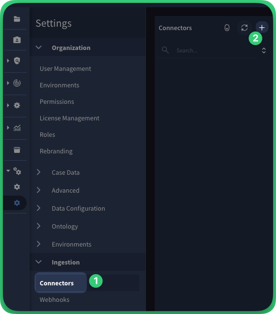 From the SOAR Settings menu you need to go to Ingestion -> Connectors (1) -> Create New Connector (the '+' button) (2)