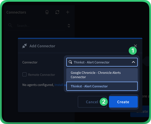 In the Add Connector box that pops up, look for the Thinkst - Alert connector option (1), and click on Create (2).