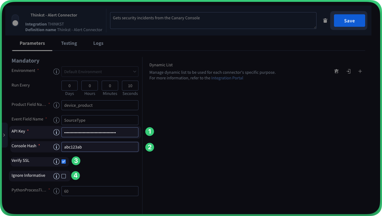 Here, you add your API Key (1) and Canary Console Hash (2), and leave the Verify SSL (3) checkbox ticked. Next, click on Save (5).