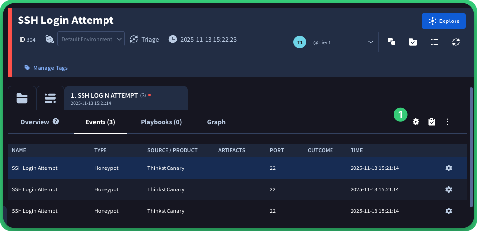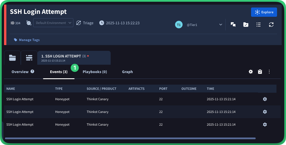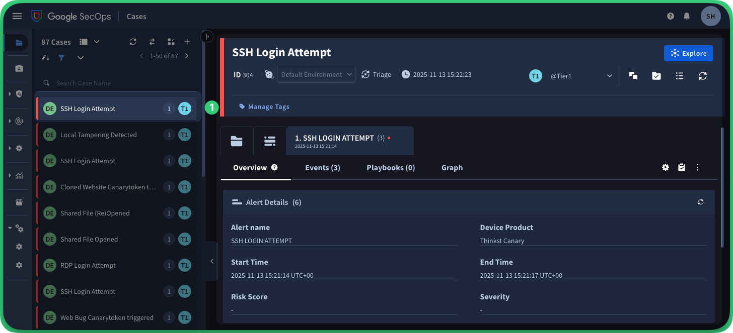 This will load the page shown below, displaying all Google SecOps cases, including those from the Canary Console. Take a look at the SSH Login Attempt as an example (1):