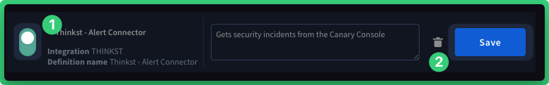 Next, you can Enable (1) the connector by clicking on the toggle in the top-left, and then click on Save (2).