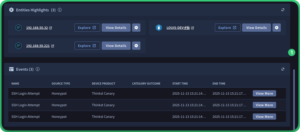 This displays the various events associated with this specific SSH Login Attempt incident. When you click on one of these events (1), it will display detailed information about the event on the right-hand side (2), where you can find information similar to what is available on the Canary Console. The screenshot below only shows some of the fields, more can be revealed by scrolling down.