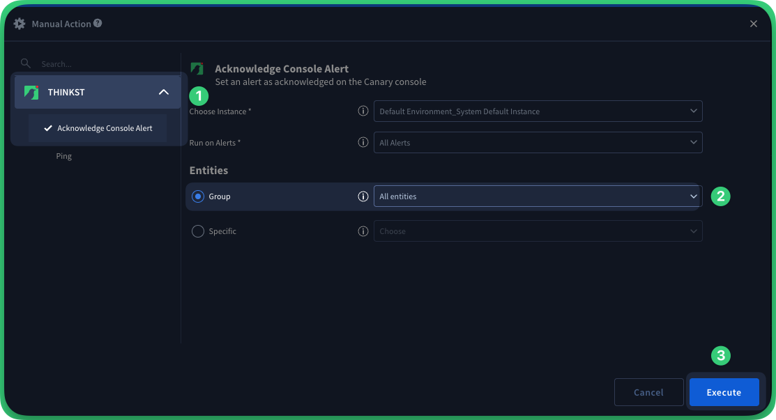 When you select Run Manual Action a action window will open. Go to THINKST -> Acknowledge Console Alert (1). Select All Entities (2) in the Group field. Leave the rest of the settings as default, they are not applicable for this Action. Then click on Execute (3).