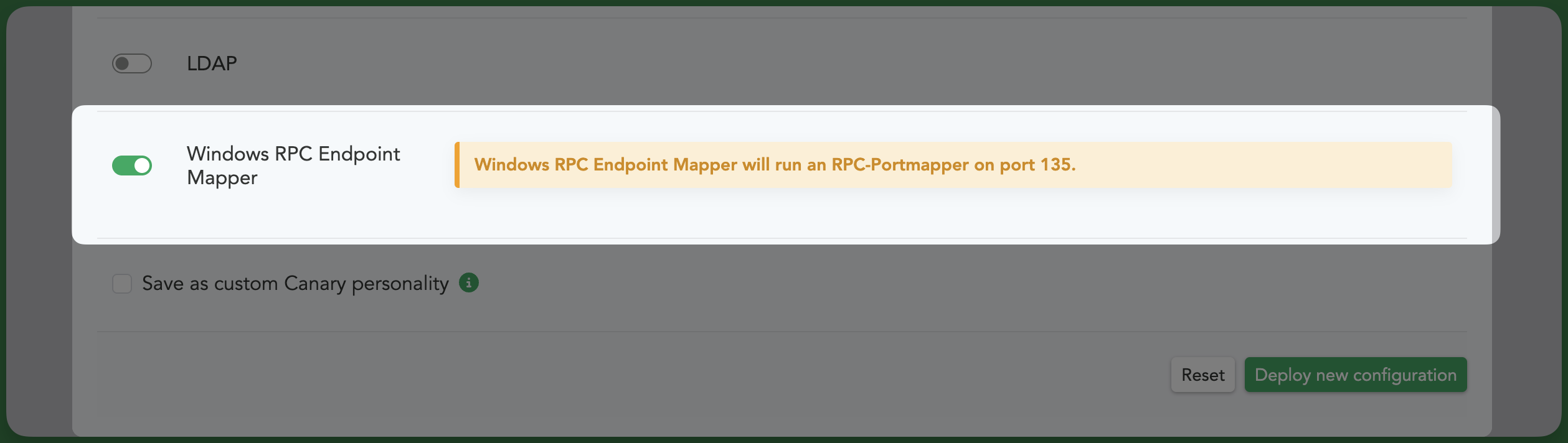Canaries can run a Windows RPC endpoint mapper on port 135 that will alert when a client binds to it.