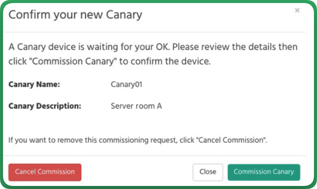 In your hosted Console, you'll get a pop-up notification with the details of your newly configured Canary. Carefully verify the details and approve the registration.
