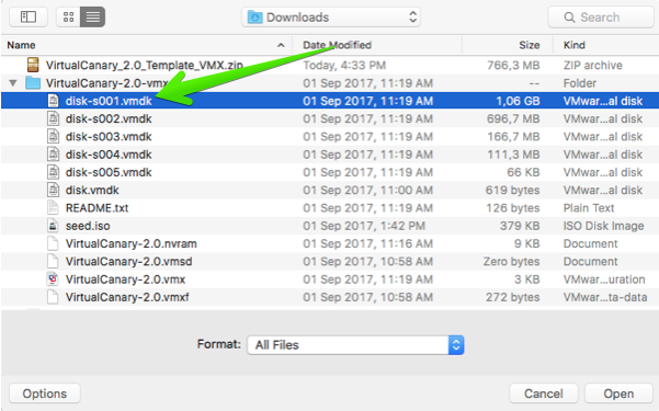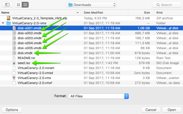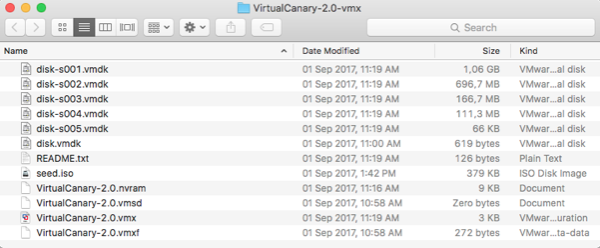 Repeat for disk-s002.vmdk, disk-s003.vmdk, disk-s004.vmdk, disk-s005.vmdk, disk.vmdk, seed.iso, VirtualCanary-2.0.vmx, VirtualCanary.vmxf.
