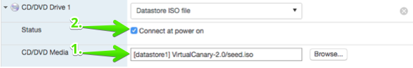 In the Settings window confirm that the CD is configured to use VirtualCanary-2.0/seed.iso and Connect at power on is checked: