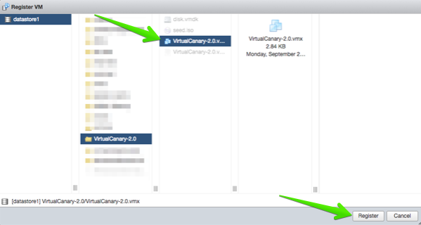 In the pop modal, browse to VirtualCanary-2.0.vmx and click Register.
