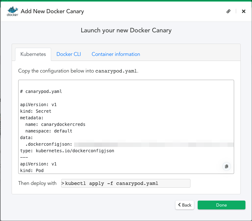 The first tab shows a Kubernetes configuration file, the second tab shows commands to run your Docker Canary directly with the Docker CLI, and the final tab shows the container image repository and retrieval information.
