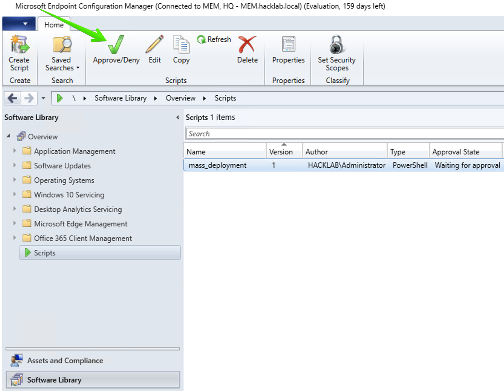 Go to Software Library and select the script that you created above. Click on the Approve/Deny ribbon item.